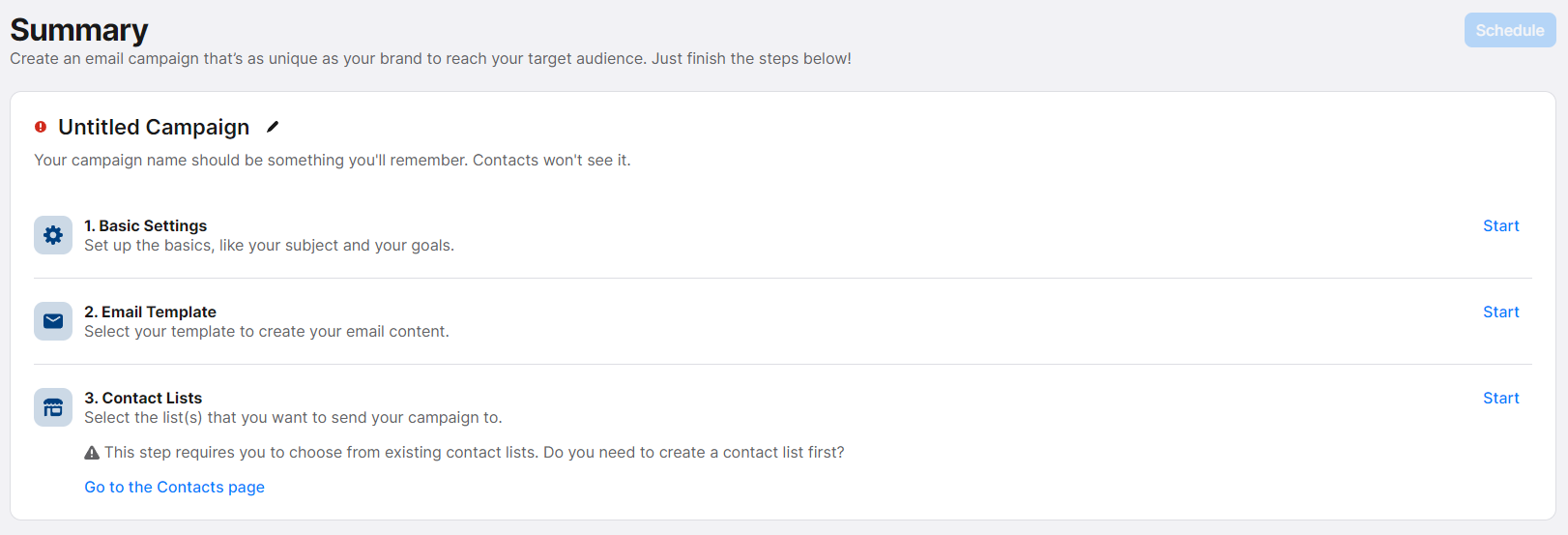 - Create a new campaign from scratch, providing the campaign name, and clicking Start under each section: