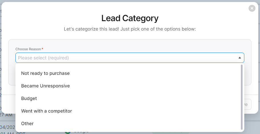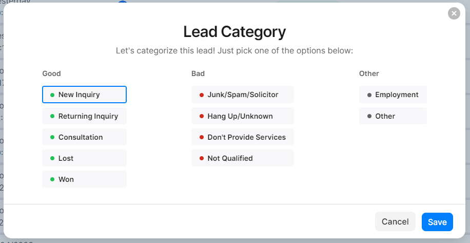 Other Leads: Other allows you to identify a lead that doesn't match the criteria for a Good or Bad lead. The subcategories to choose from are: