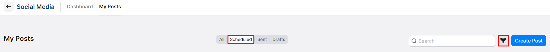 - Note: You can view only Scheduled posts by selecting the Scheduled tab in the top section or using the filter button to filter by post status.