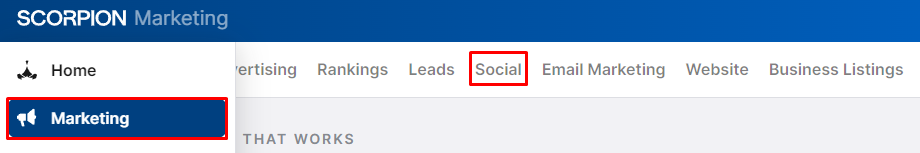 - Navigate to the Social Media section by selecting the Marketing Suite in the left-hand navigation and clicking on Social in the upper navigation. You can also go straight to the app and get started.