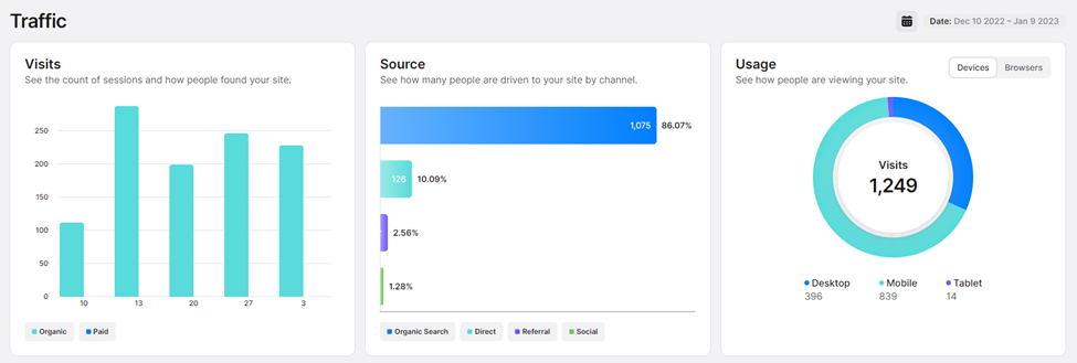 Within the Website section, traffic data is pulled in from your Google Analytics account and filtered to your website, allowing you to gain invaluable insights into the traffic patterns from organic efforts. On the main chart of the Traffic page, you will be able to filter to different traffic metrics.