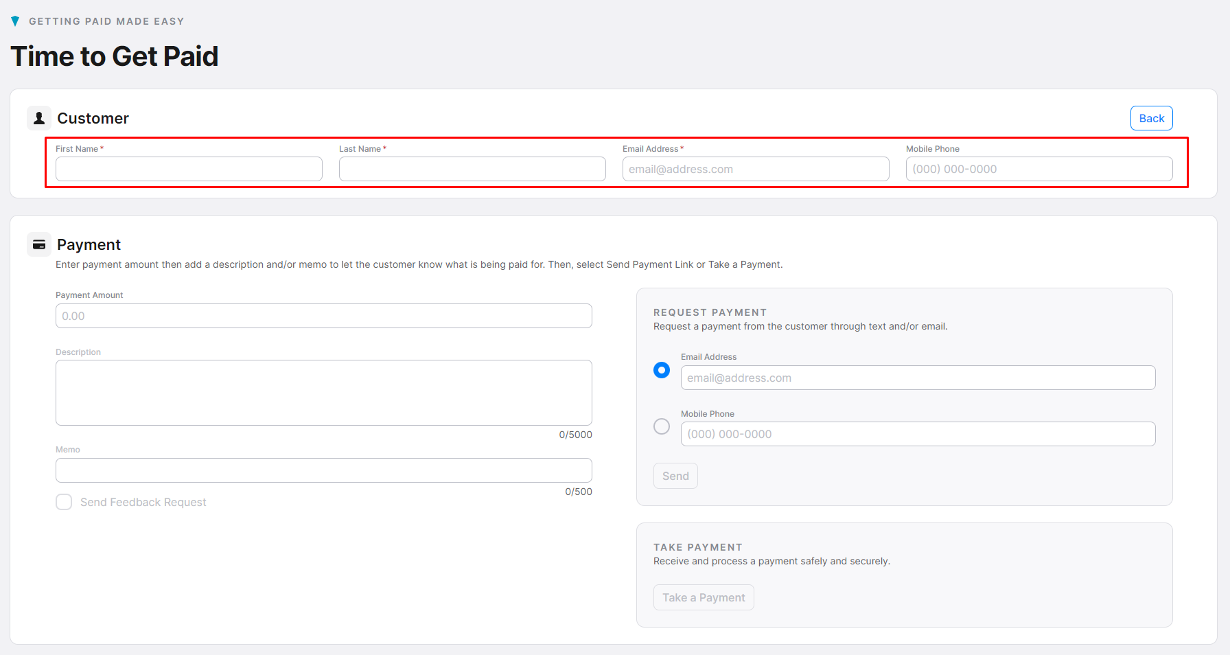 - Note: If you would like to take the payment instead of sending a request, click “Take a Payment."
